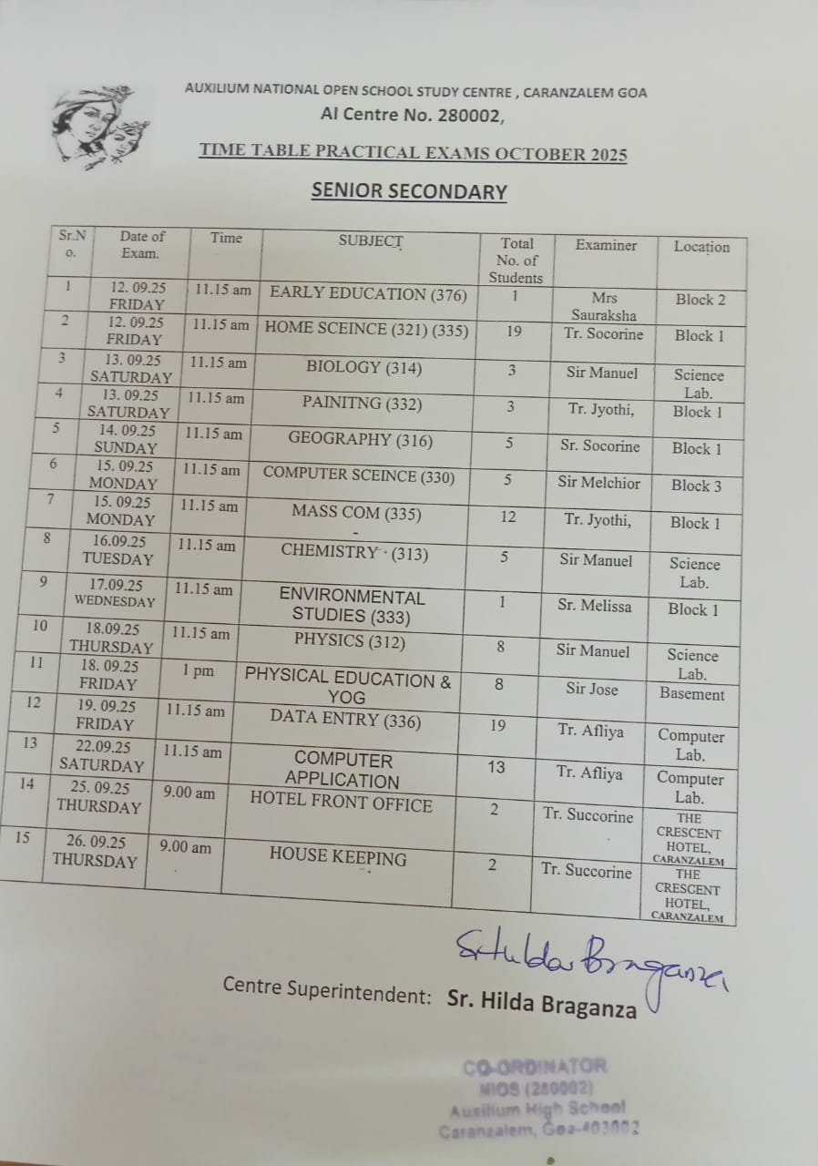 Time-Tables for NIOS Oct-Nov 2025 Practical Examination